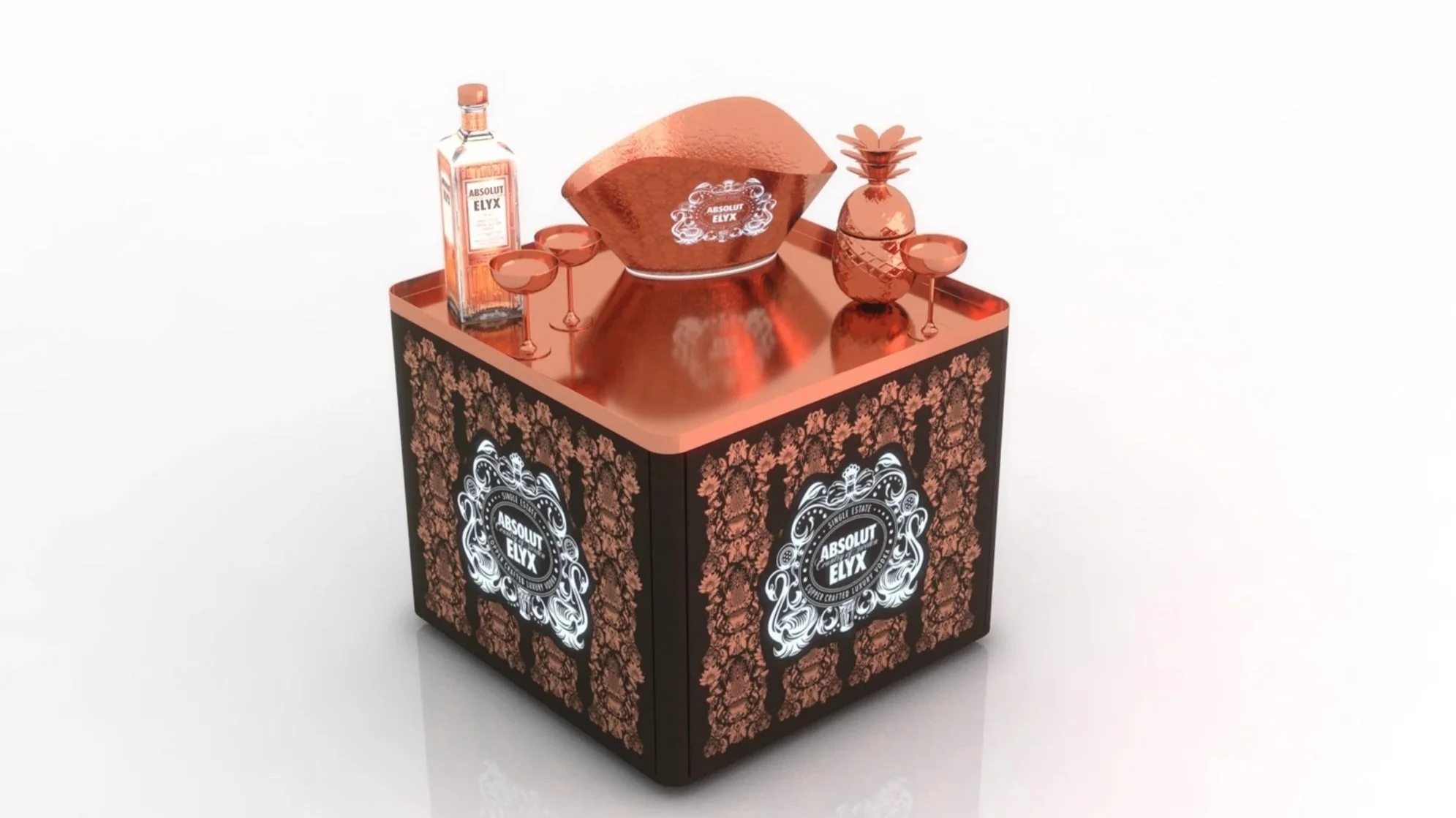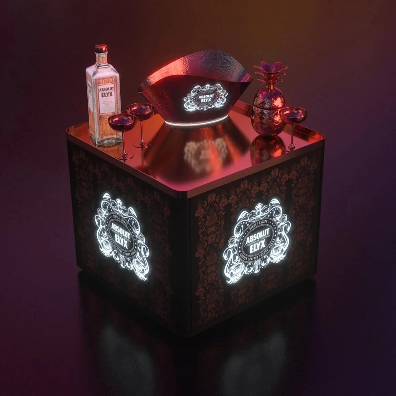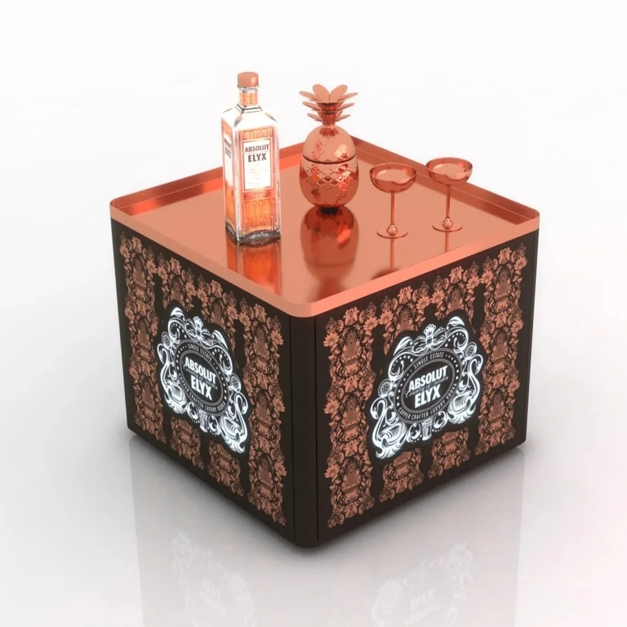 EYEDENTITY a imaginé, dessiné et fabriqué un modèle de tables lumineuses personnalisées ABSOLUT ELYX en s’inspirant des guidelines de la marque : création un plateau supérieur en aspect cuivre, parois latérales en métal, sérigraphiées cuivre, logo ABSOLUT ELYX rétroéclairé au moyen d’un pod lumineux intégrant une batterie rechargeable, à l’intérieur de la table.